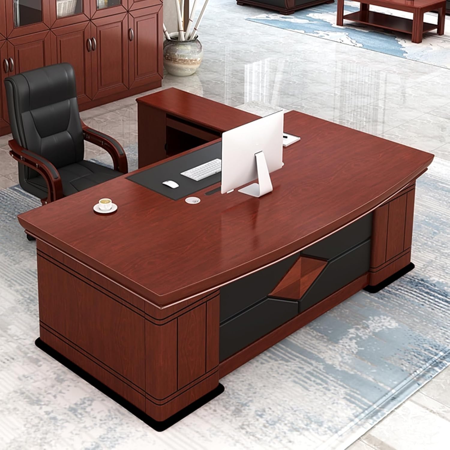 Crafted with a luxurious wood veneer, this desk exudes a classic executive presence while offering practical features tailored for modern office needs. It includes a movable extension that provides additional workspace or can function as a side return, perfect for organizing files, hosting meetings, or supporting office equipment. The integrated pedestal offers convenient storage with lockable drawers for securing documents and personal items, while the built-in grommet holes ensure seamless cable management, keeping your desktop clean and clutter-free. Sturdy, spacious, and elegantly designed, this 1800MM executive desk combines style and efficiency—ideal for decision-makers, managers, and professionals who value both aesthetics and productivity.