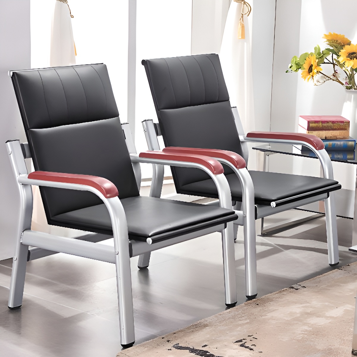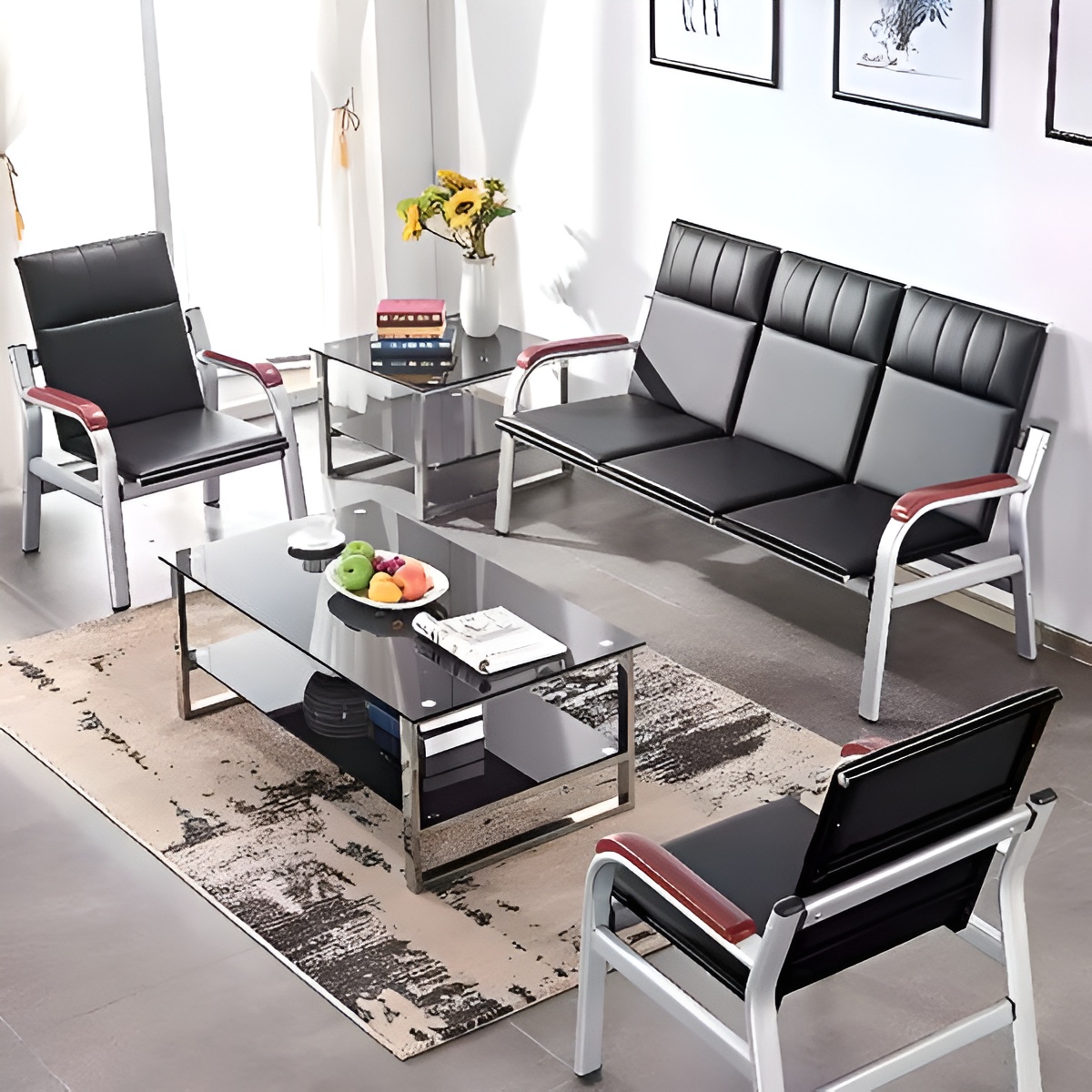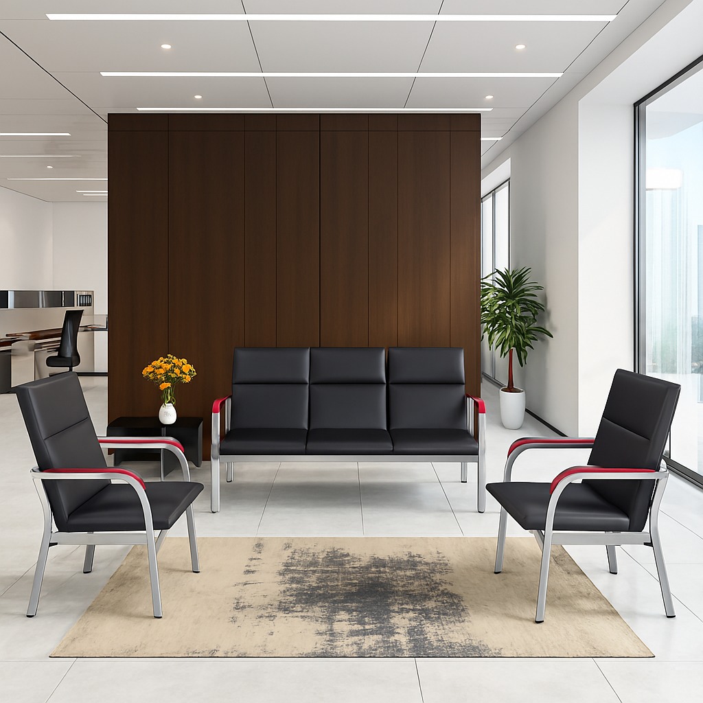 Enhance your reception or executive lounge with this modern office sofa set that blends style, comfort, and durability. Designed with a sleek metallic frame and upholstered in high-quality leather finish, it offers a refined look ideal for professional spaces. The set includes a spacious three-seater and matching single seats, providing ample and comfortable seating for guests or clients. Its minimalist design, complemented by subtle red arm accents, adds a touch of sophistication to any modern office environment.