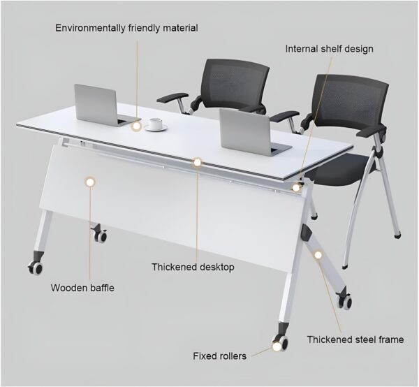 Upgrade your training or meeting room with this versatile foldable office table. Measuring 1.2 meters by 60 centimeters, it’s compact yet spacious enough for individual workspaces or group setups. The durable tabletop pairs with a sturdy foldable metal frame, while movable lockable casters make it easy to shift and reconfigure your space as needed. When not in use, simply fold and roll it away for efficient storage.