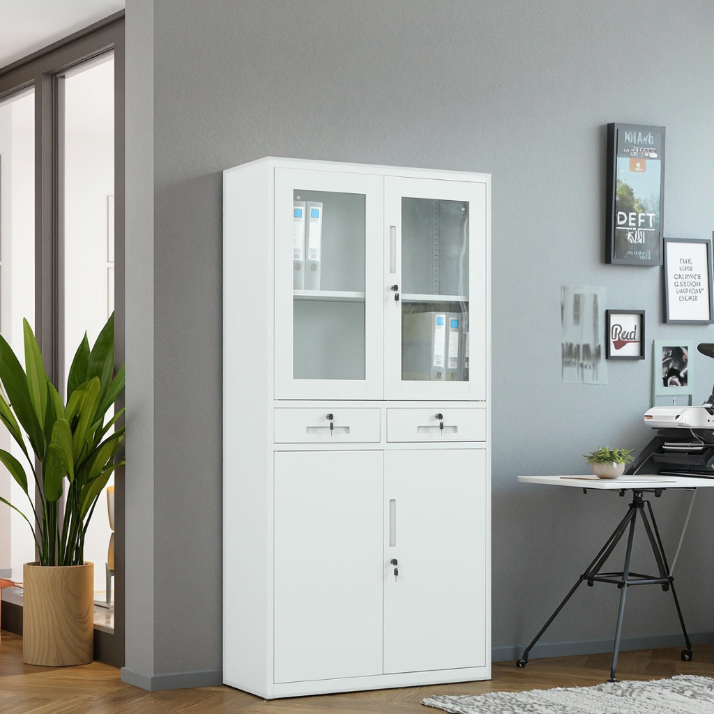 Upgrade your office organization with our Half Glass Cabinet, a perfect blend of display and secure storage. Designed for modern offices, this cabinet features a stylish upper section fitted with clear glass doors, allowing you to neatly display files, awards, books, and decorative items while keeping them protected from dust.