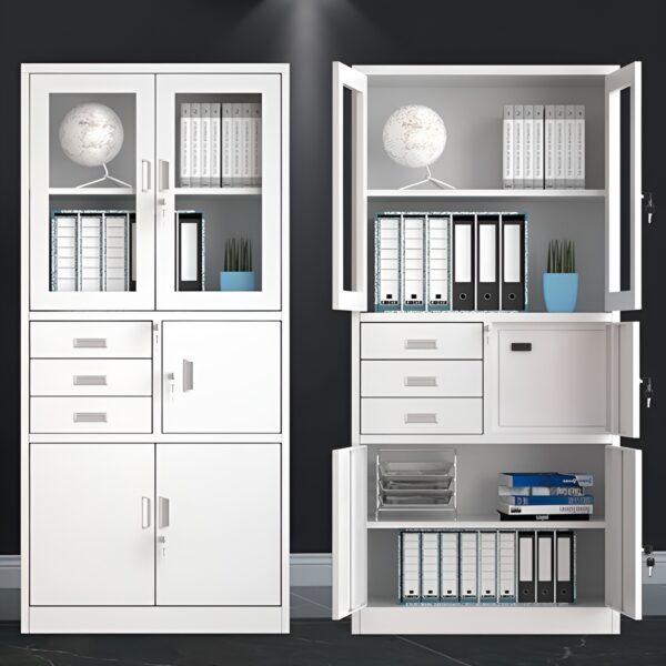 Keep your office organized and secure with this Half Glass Filing Office Cabinet. Crafted from durable metallic material, it features a half-glass upper section for displaying files, books, or office accessories, and a solid lower section with a built-in safe for securing sensitive documents and valuables. The cabinet includes adjustable shelves for flexible storage configurations, making it a versatile addition to any modern office space.