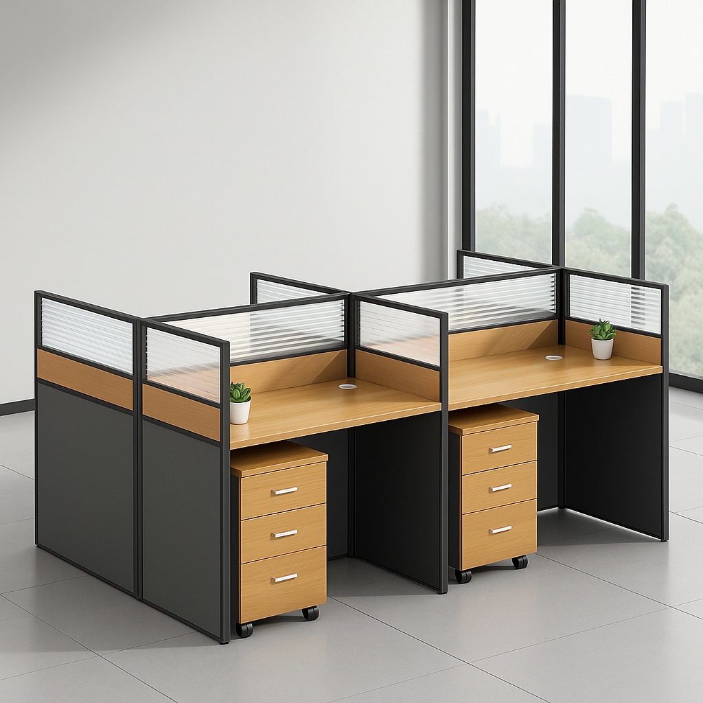 Modern 4-Way Office Workstation designed to enhance productivity and teamwork in a shared office space. It features durable panel partitions with a frosted glass top for privacy, spacious laminated desktops, and mobile drawer pedestals for personal storage. Ideal for corporate offices, co-working spaces, and call centers. Stylishly finished in neutral tones with a pop of color for a fresh, professional look.