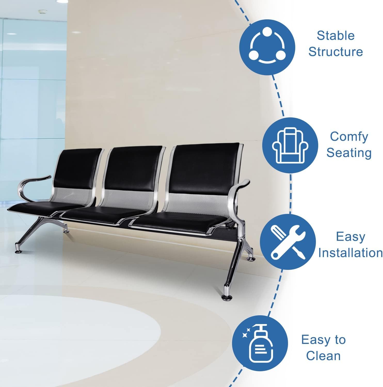 Provide comfortable and organized seating for visitors with this durable metal bench designed for office and public waiting areas. The three-seat configuration offers ample space, while the sturdy frame ensures long-lasting performance. Its simple, functional design fits perfectly in receptions, hospitals, institutions, and other high-traffic environments.